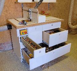 The table has a short fence running front to back, adjusted by an Incra LS Positioner I can use it for very detailed work when I need to work to fine tollerances. It has a 36mm MDF top, laminated with Formica, together with the rest of the carcase it weighs a tonne! The router is completely enclosed in the central compartment and is one of the quietest machines in the shop.