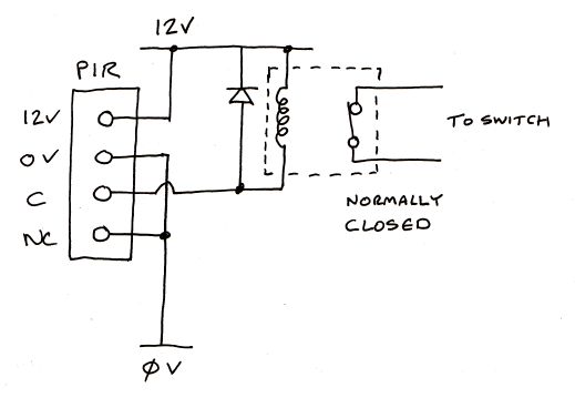Note that it says "normally closed" contacts should be used. That might seem wrong but it's because the relay will be energised most of the time and only turn off when the PIR detects someone. So in fact the contacts will be open most of the time.