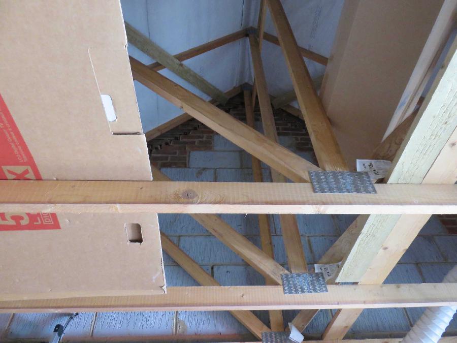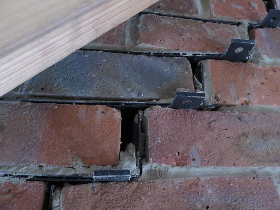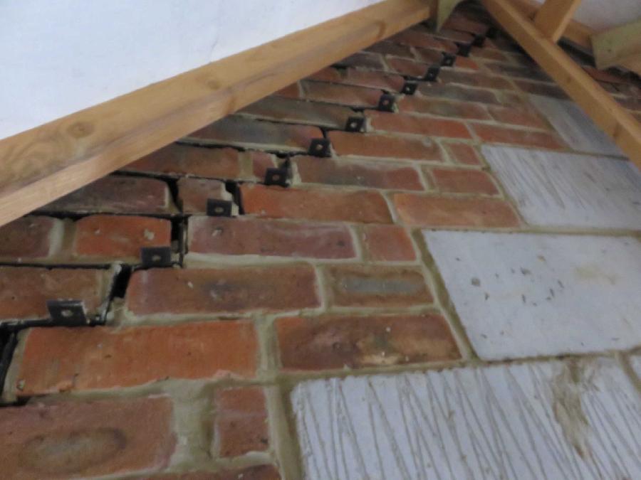 See area of concern running diagonally along the roof line, roughly one brick from the roof beams: